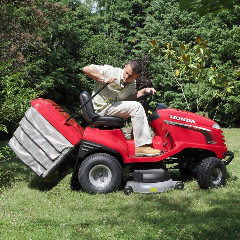 Высота скашивания травы регулируется центральным механизмом, и можно установить разную высоту для различных типов газона. Срезанная трава идет в травосборник большого объема (300 л). Такая конструкция обеспечивает уход за газоном без частой остановки. При заполнении травосборника подается звуковой сигнал, и трава выгружается нажатием специальной кнопки. При необходимости можно установить мульчирующую насадку, которая позволяет удобрять газон во время кошения. Также возможна работа в режиме выброса травы в сторону.